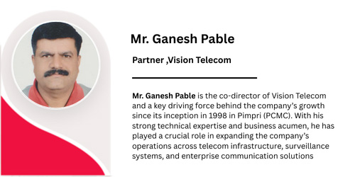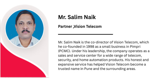 VISION TELECOM is a trusted partnership firm located on Ajmera Morwadi Road, Pimpri, operating from a well-equipped showroom and service centre spread across 600 sq. ft. The company is led by Mr. Salim Naik and Mr. Ganesh Pable, who bring years of experience and dedication to the business. Since its inception in 1998, VISION TELECOM has grown steadily, evolving with the changing needs of the industry and expanding into multiple domains. Our core vision is to deliver high-quality products and solutions that precisely meet the requirements of our customers. With a strong emphasis on customer satisfaction, we have built a solid reputation and proudly serve a wide base of loyal and highly satisfied clients.